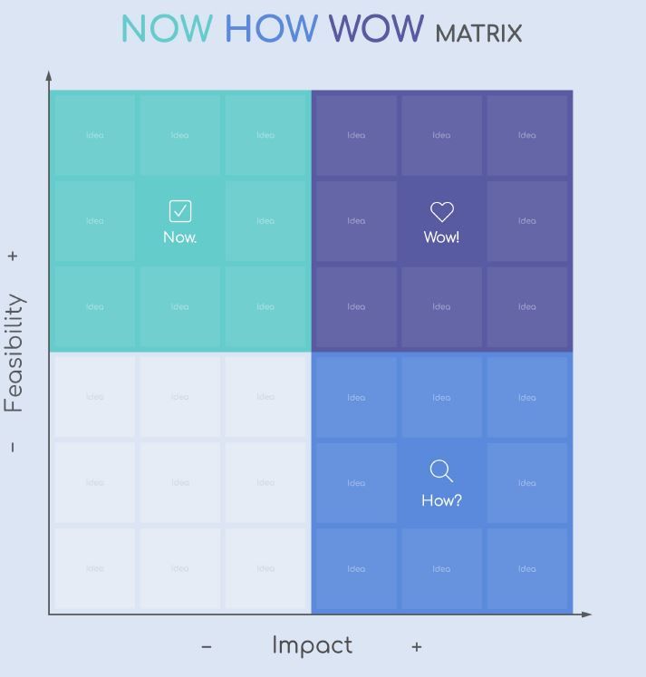 Chiedi agli studenti di selezionare le loro idee migliori. Per questo esercizio potete usare il file "Idea selection matrix" disponibile nella sezione "Documenti", in cui verranno riportate tutte le idee scritte precedentemente sui post-it. Le idee che possono essere facilemnte implementate e che non hanno un grande impatto saranno inserite nell'angolo in alto a destra ("Quick wins"). I concetti più impattanti che richiedono ancora indagini tecniche saranno nel quadrante "how" ("come" - in basso a destra). Le idee d'impatto che possono essere eseguite saranno collocate nella casella "wow". L'obiettivo è di formare quante più idee possibili in questa categoria. Cerca di migliorare le idee per farle muovere verso l'angolo in alto a destra migliorandone la fattibilità o l'impatto.